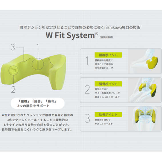 W型に設計されたクッションが腰椎と腸骨と肋骨の3点をやさしくホールドすることで理想的なS字ラインの座り姿勢を自然と保つことができ、長時間でも疲れにくいラクな座りをキープします。